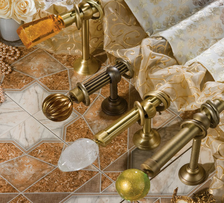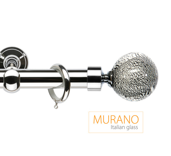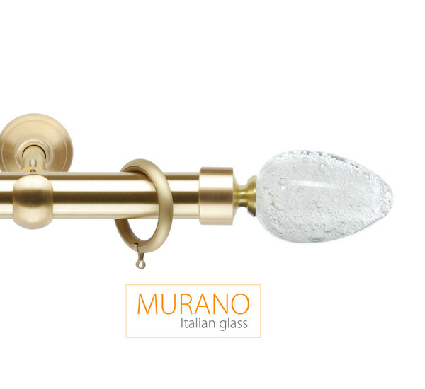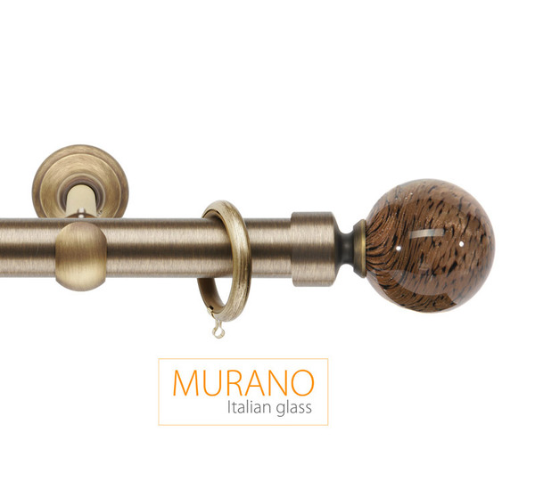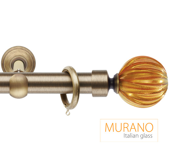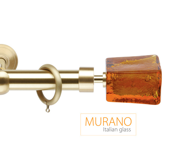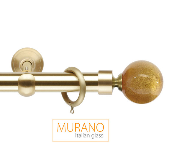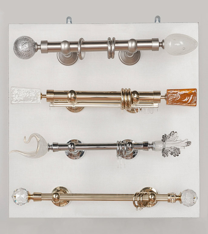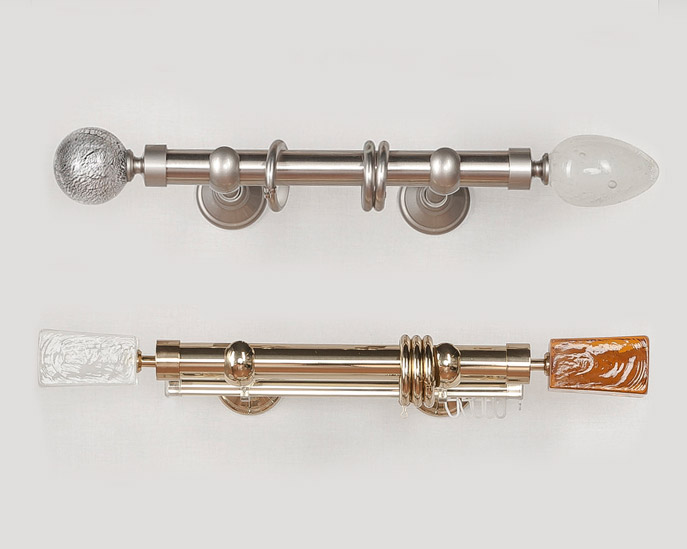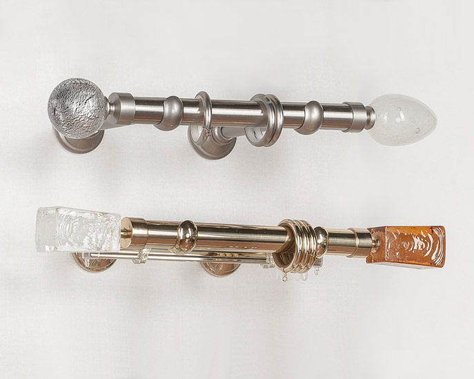 «Мурано Модерн» — эксклюзивная коллекция декоративных карнизов D20 и D30 мм. Ручное изготовление наконечников придает коллекции неповторимый вид, а оригинальные вкрапления из серебра и золота, делают их поистине уникальными. В качестве материала используется знаменитое Венецианское стекло. Высокопрочный сплав латуни используется для производства труб и кронштейнов. Так же комплектующие покрываются специальным защитным лаком, для предохранения поверхности от внешних дефектов и сохранения первозданного вида. Цвет наконечника и адаптера выбираются отдельно, по каталогу можно подобрать их к цвету трубы, кронштейнов и колец и создать абсолютно неповторимый дизайн.