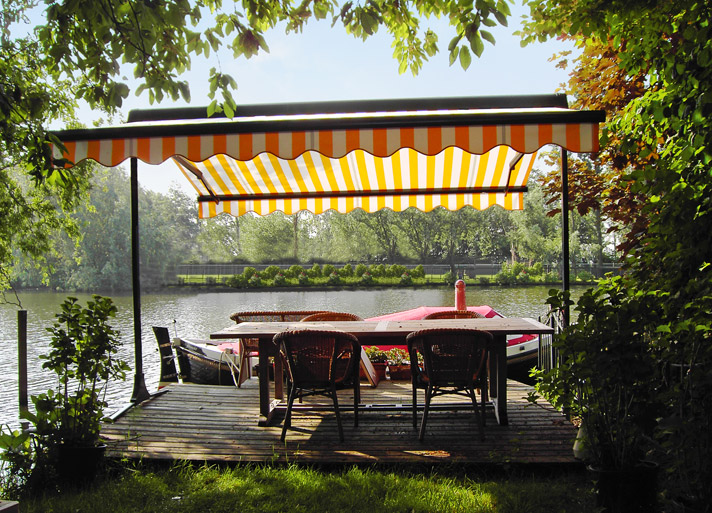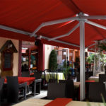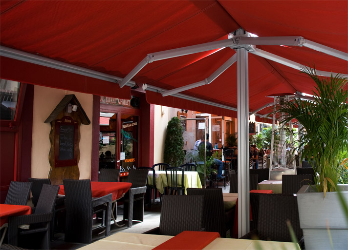 Двусторонняя отдельно стоящая маркиза не только затеняет большую площадь, но и защищает от кратковременных ливней. Так как центральная опорная балка в данной модели не используется, пространство под маркизой может быть использовано с наибольшей эффективностью. Эта модель может применяться в самых разнообразных местах: в ресторанах и частных домах, детских садах и на праздниках под открытом небом.